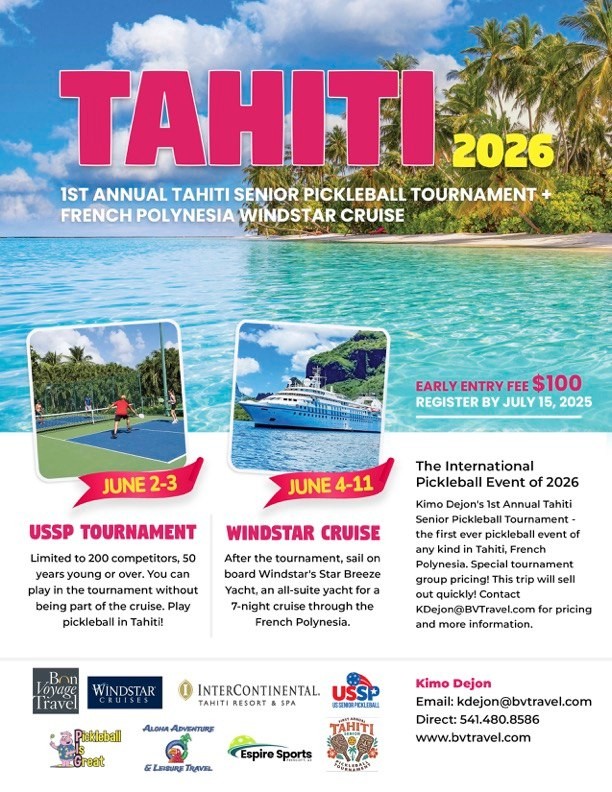 Live your dream. Seniors 50 and over are invited to come play in a two day Senior Pickleball Tournament June 2nd and 3rd 2026, then join the "Dreams of Tahiti Pickleball Cruise" adventure with Windstar Cruises sailing on the beautiful all-suite Star Breeze yacht. A wonderful seven (7) night sailing from June 4 - 11, 2026, under a full moon, which includes Tahiti, Moorea, Huahine, Raiatea and Bora Bora and more!