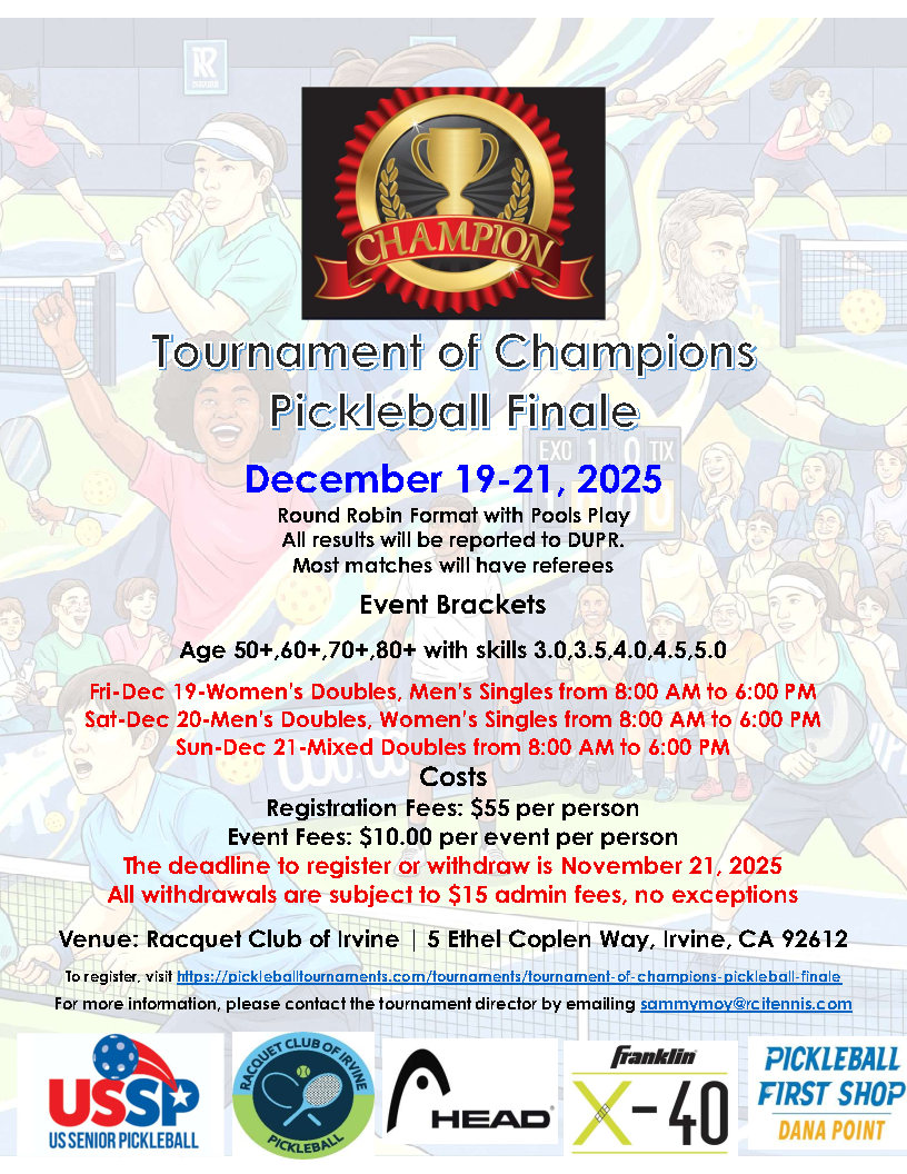 Register for the Tournament of Champions Pickleball Finale in Irvine, CA by December 14, 2025.