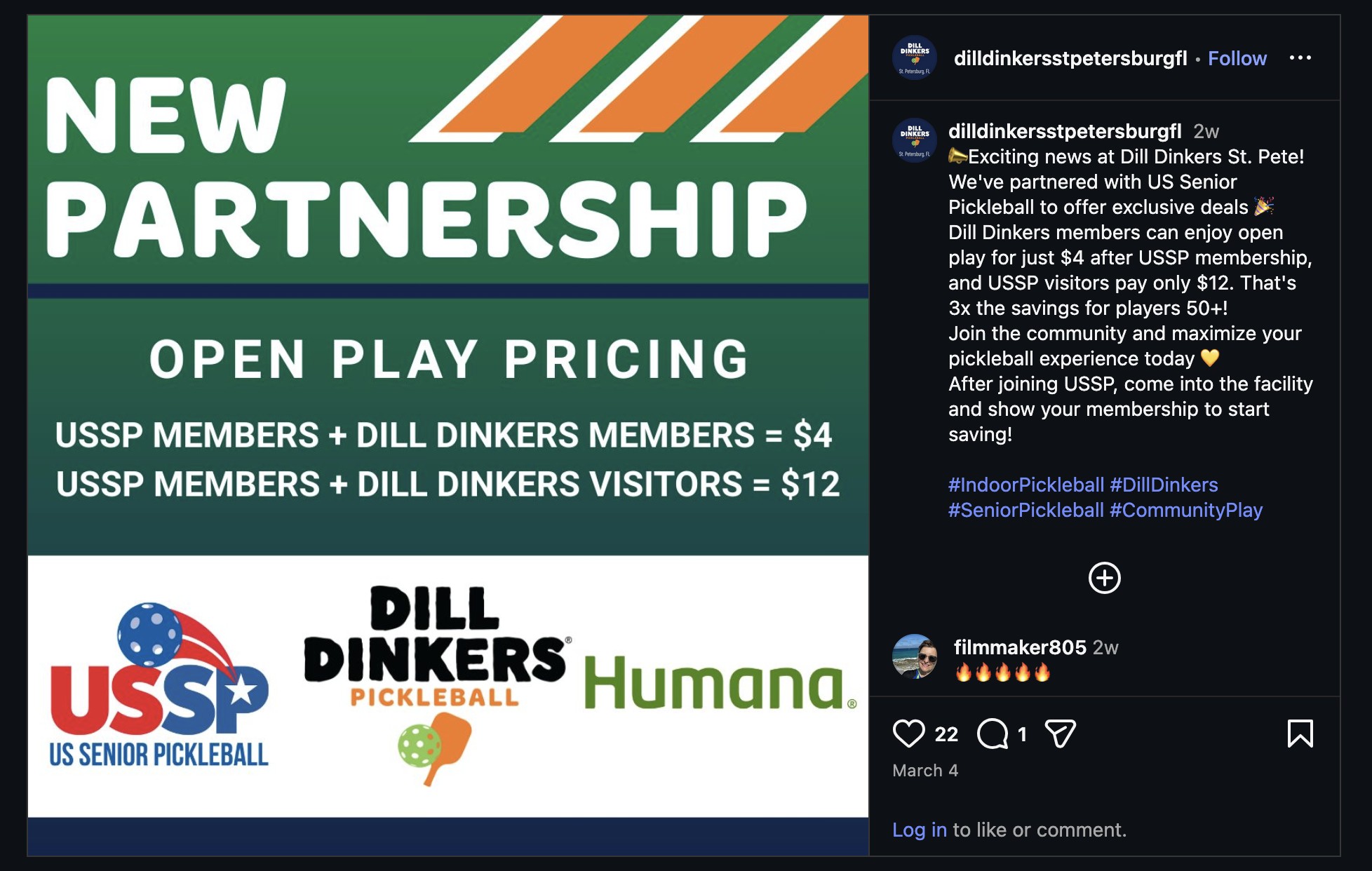 USSP partnership offers exclusive deals to Dill Dinkers members and USSP visitors. Discounted open play for USSP members during ALL open play times at Dill Dinkers in St. Petersburg, Florida.Submitted: 03/28/26